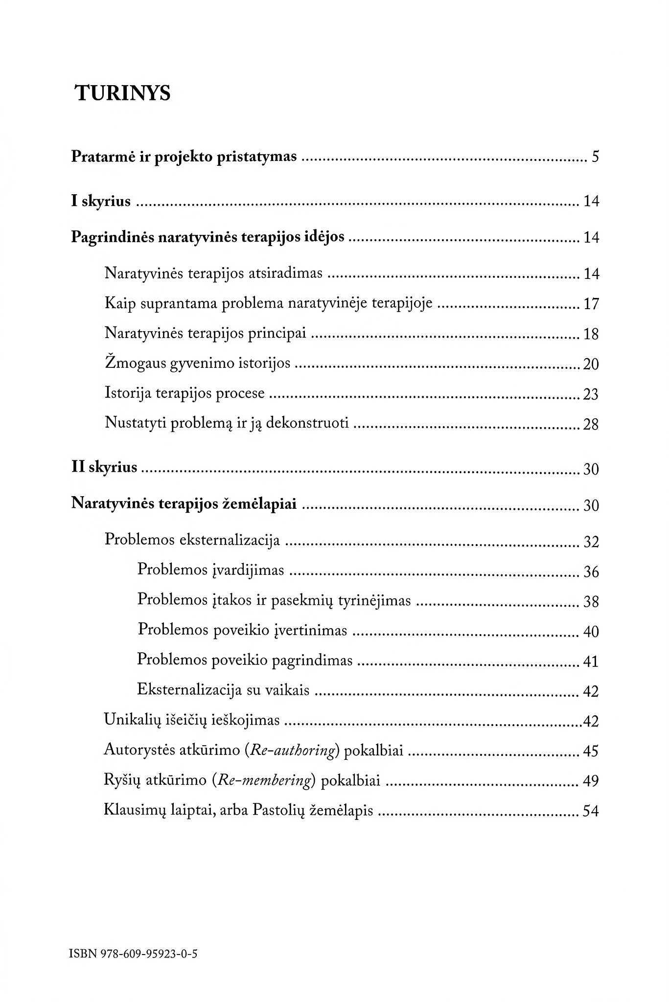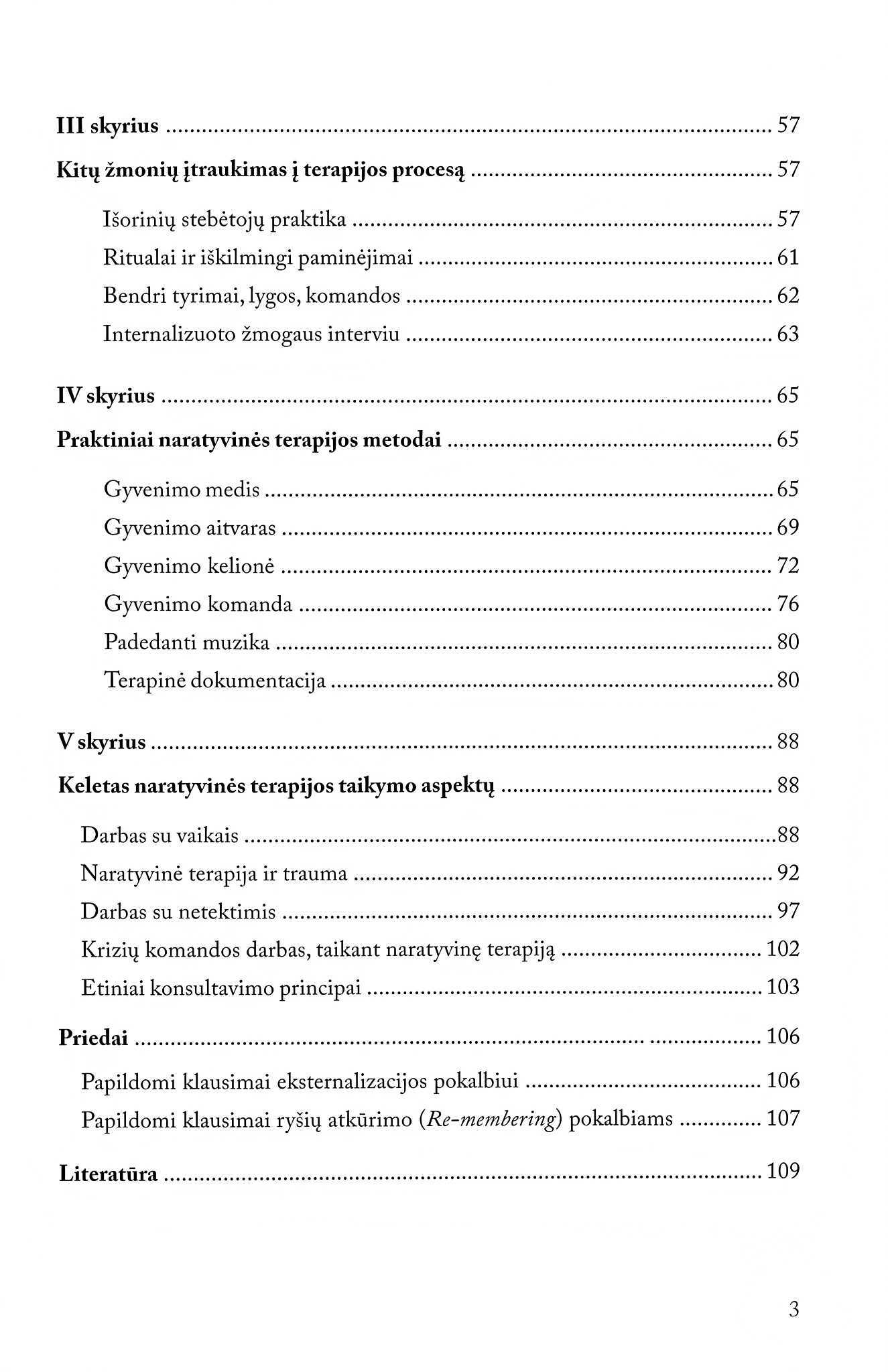 Šioje knygoje naratyvinė terapija aprašoma kaip vienas iš sisteminio šeimos konsultavimo modelių. Naratyvinė terapija sukurta Australijoje ir yra populiari visame pasaulyje. Knygoje aptariami pagrindiniai naratyvinės terapijos principai, aprašomi praktiniai metodai, kuriuos galima taikyti konsultuojant šeimas, skyrių pabaigoje pateikiami klausimai žinioms patikrinti.